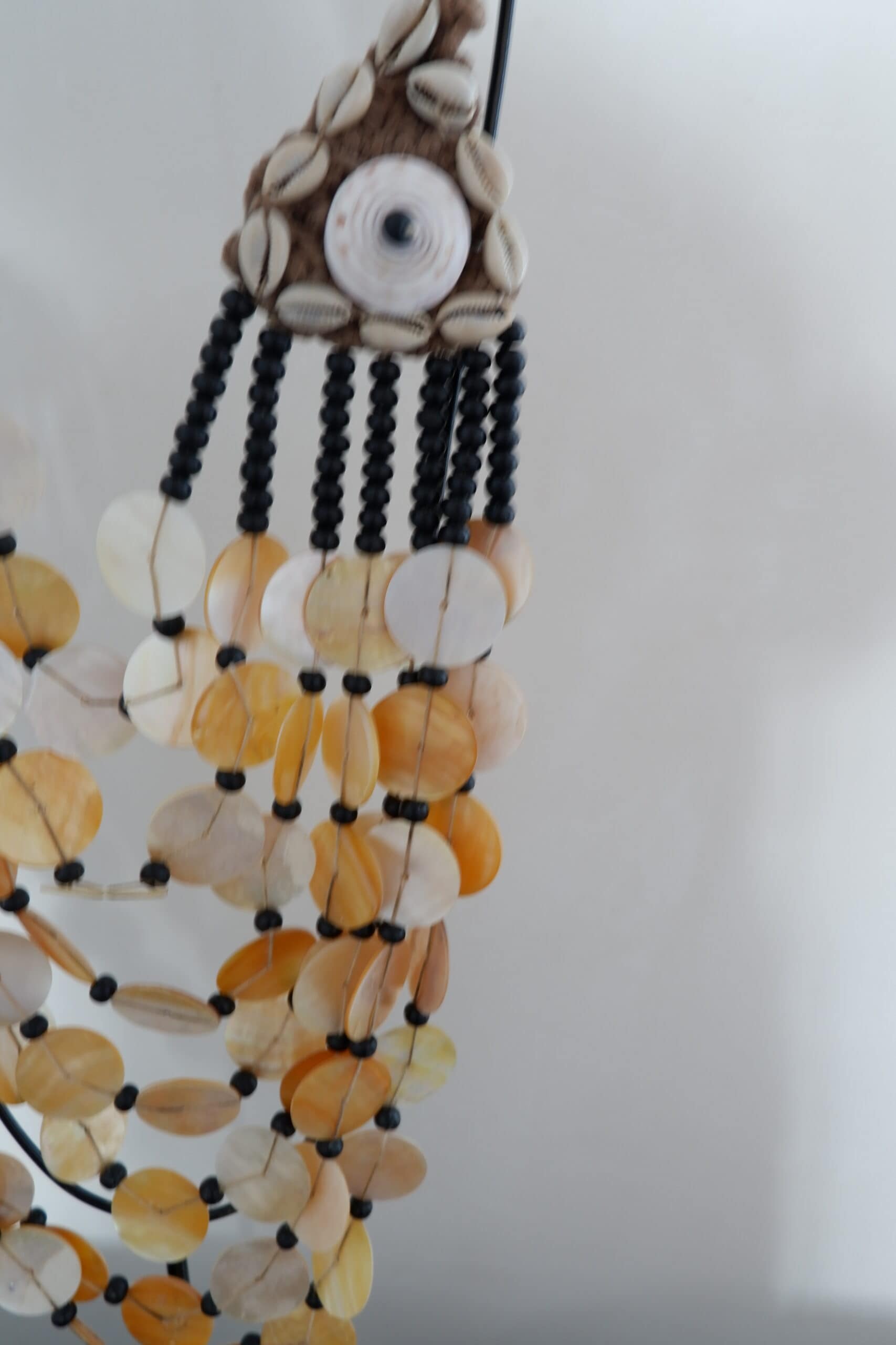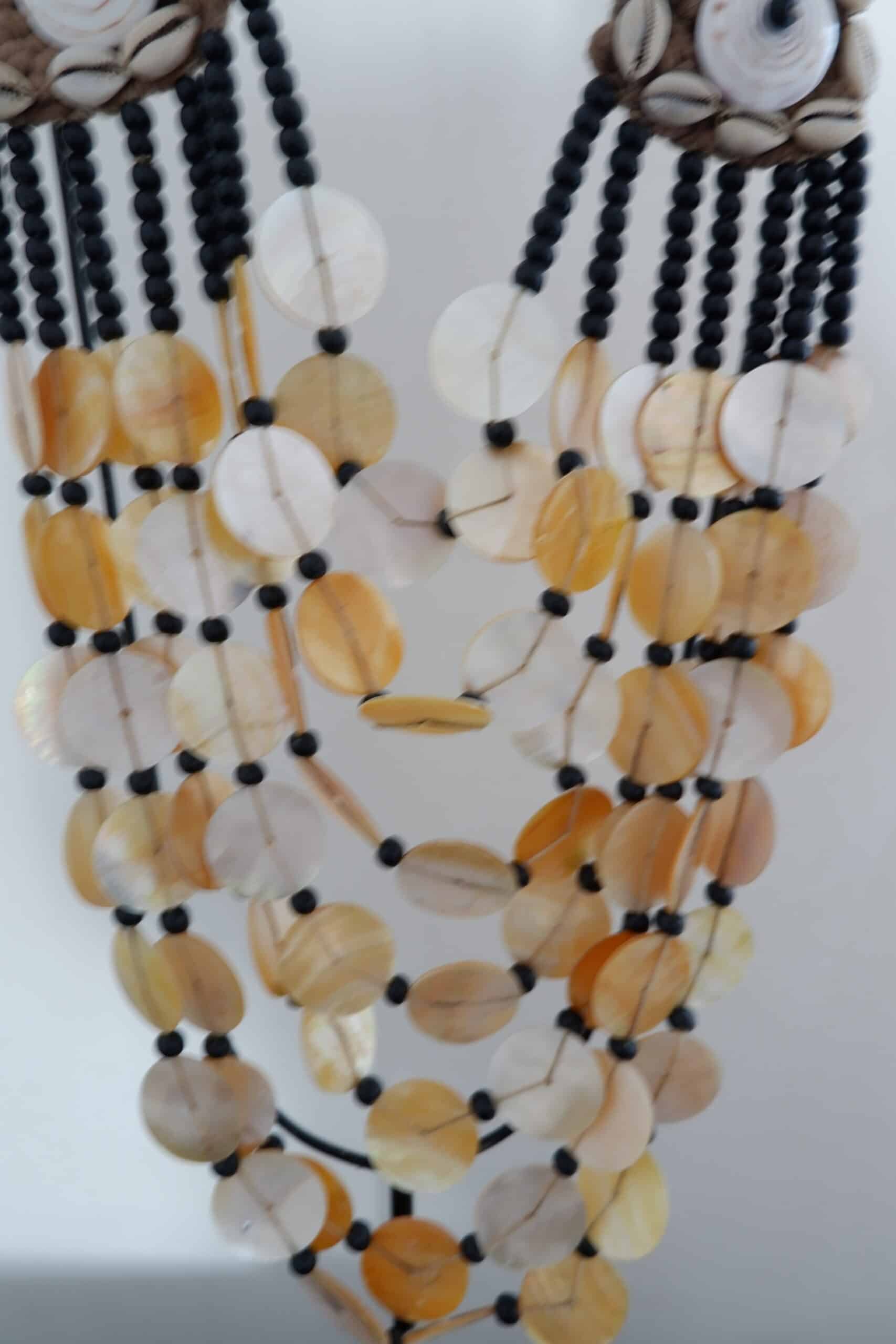 De Kalung Mabe is een mooie schelpenhanger die door 7 rijen platte ronde parelmoerschijfjes, van zachtgeel tot zoet oranje, in combinatie met de zwarte kralen in lussen vallen.