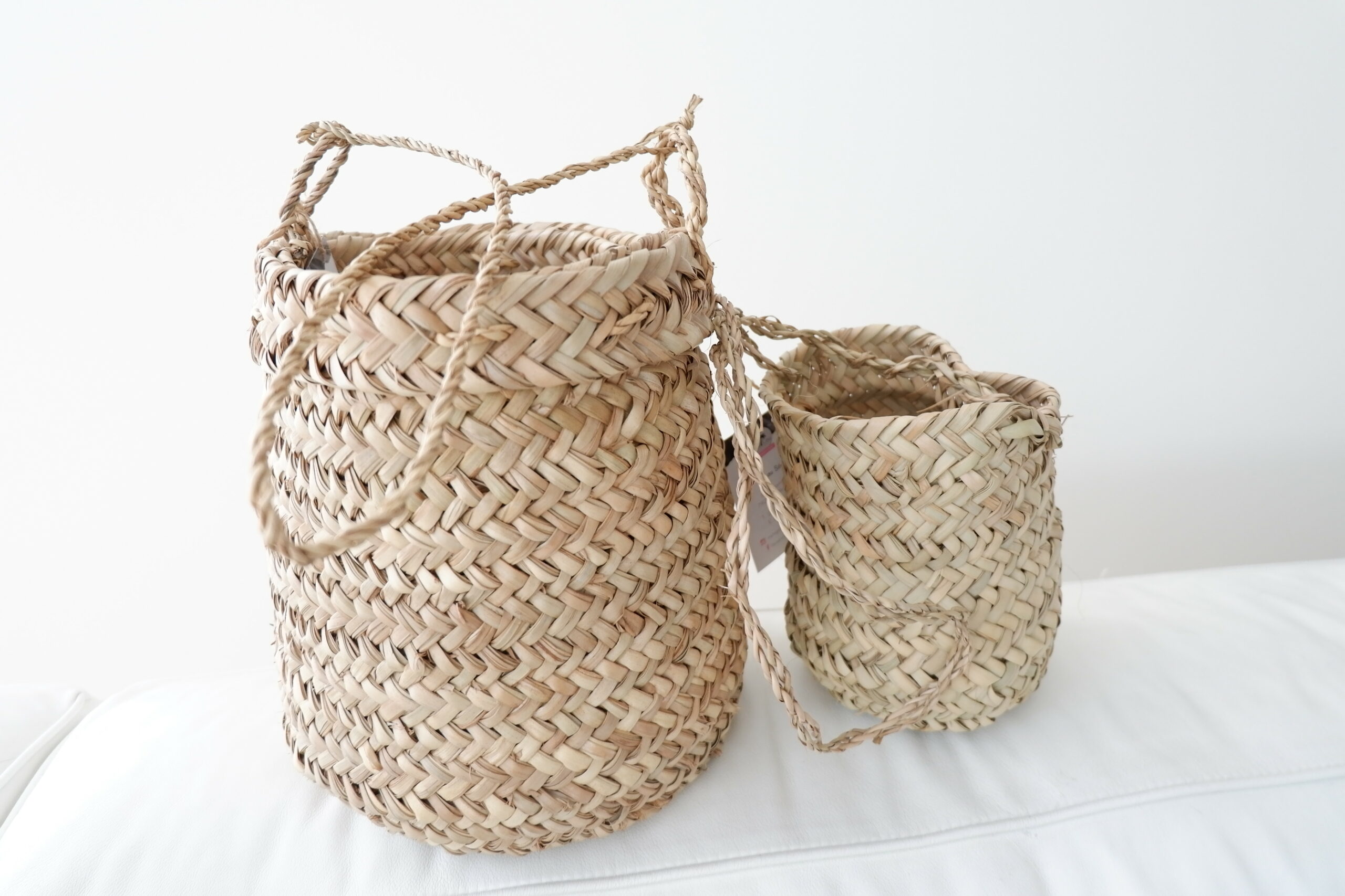 Mand van zeegras en hengsel als leuke item in de b.v. keuken voor uien, knoflook of tuinkruiden.